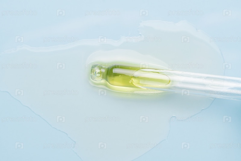 Брендинговый макет стеклянной бутылки-капельницы. Косметическая пипетка. Модный синий фон. Концепция органической и косметической косметики. Вид сверху