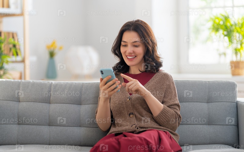 Женщина пользуется телефоном, сидя на диване