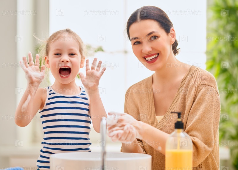Девочка и ее мама моют руки