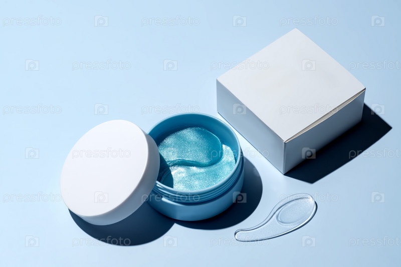 Гидрогелевые косметические патчи для глаз для ухода за кожей на синем пастельном фоне. Продукт для лифтинга кожи, борьбы с возрастными морщинами. Патчи под глаза в синей упаковке. Макет косметики
