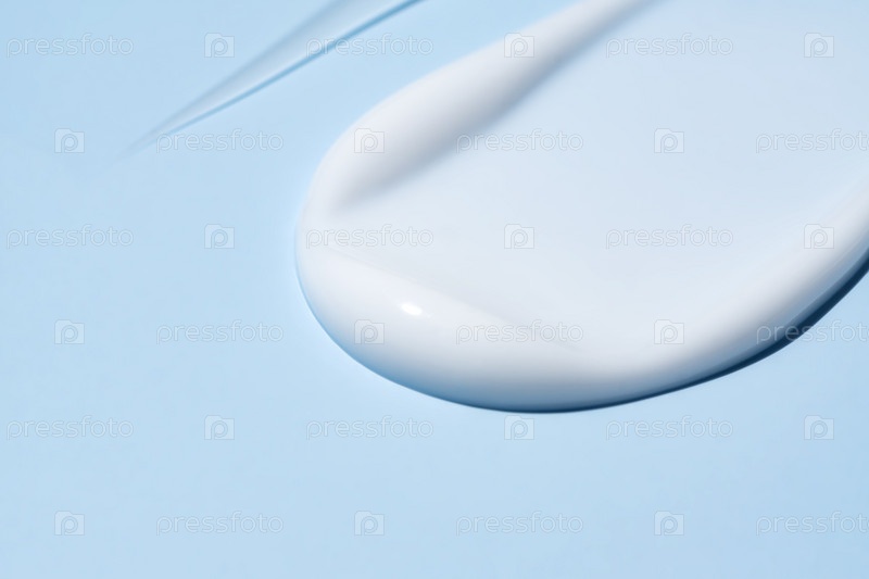 Белый косметический крем для лица или увлажняющий лосьон для тела наносится на пастельно-синий фон. Гигиеническое средство по уходу за кожей с кремовой текстурой. Образец мазка крема для лица красоты на цветном фоне