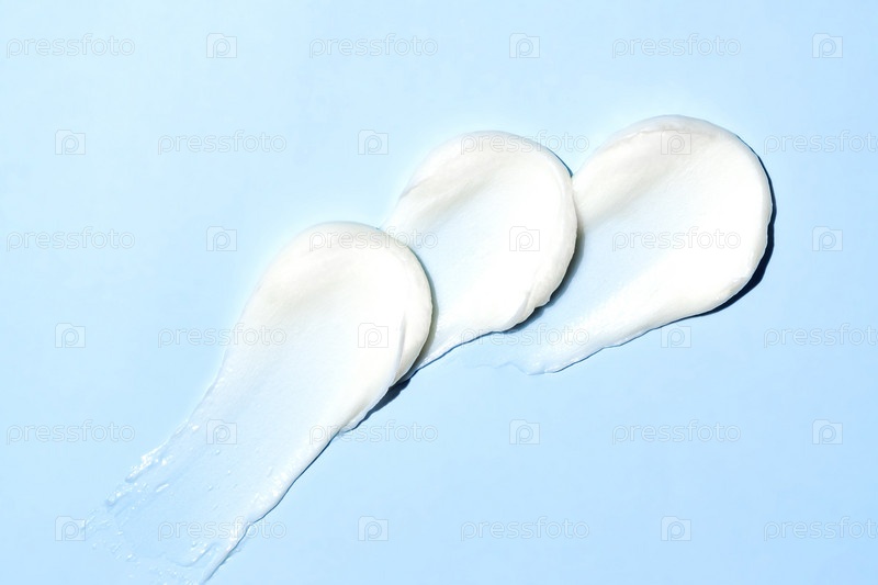 Текстура белого косметического крема, образец лосьона для ухода за кожей на синем фоне. Крем для лица, увлажняющий крем для тела, кондиционер для волос, мазок, мазок. Сливочный косметический продукт крупным планом