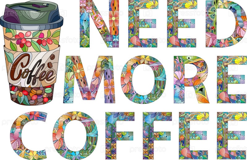 Фраза «нужно больше кофе» выделена ярким шрифтом и красочными буквами