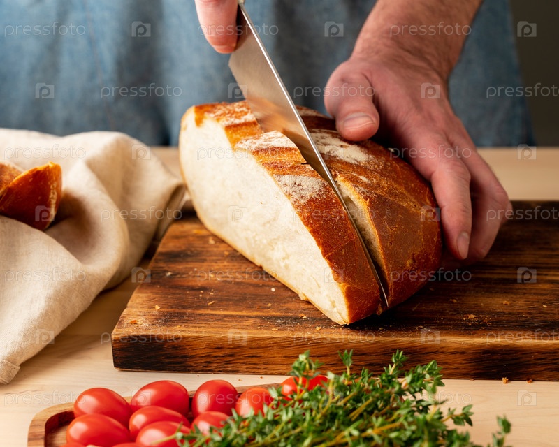 Безликий мужчина режет свежий домашний хрустящий хлеб большим ножом