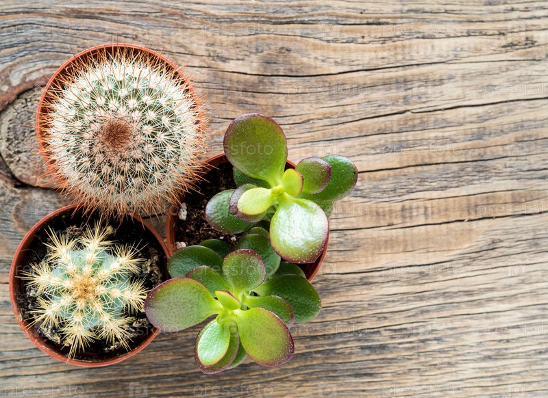 Тропические комнатные растения, кактусы и суккуленты на деревянном фоне, вид сверху