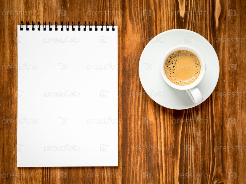 Кофе в белой чашке и открытый блокнот с чистой белой страницей на коричневом деревянном столе, вид сверху