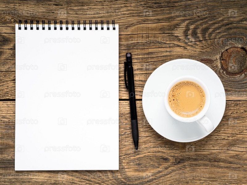 Открытый блокнот со спиралью, ручкой и чашкой кофе на старом деревянном столе, вид сверху