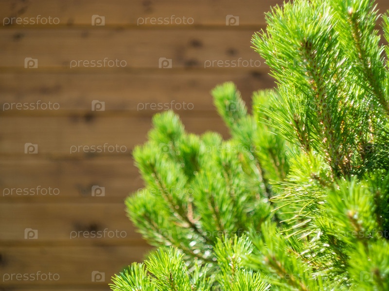 Сосновая ветка на деревянном фоне с солнечным светом летом