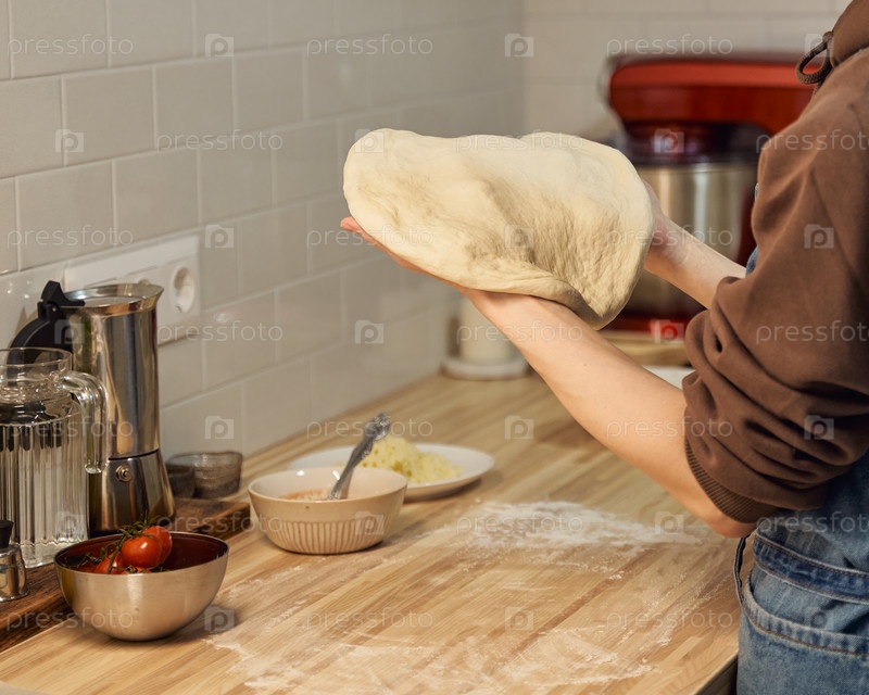 Безликая женщина замешивает тесто на кухонном столе дома, в квартире. Домашняя еда