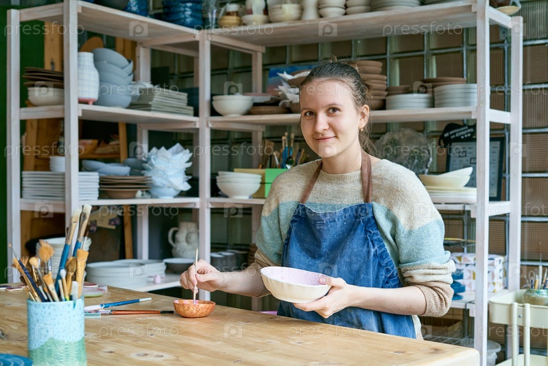 Умелая молодая женщина в фартуке стоит за столом и рисует на керамической чаше в гончарной мастерской