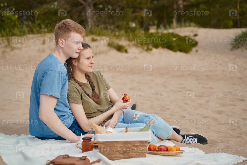 Пара подростков отдыхает на одеяле во время пикника на пляже
