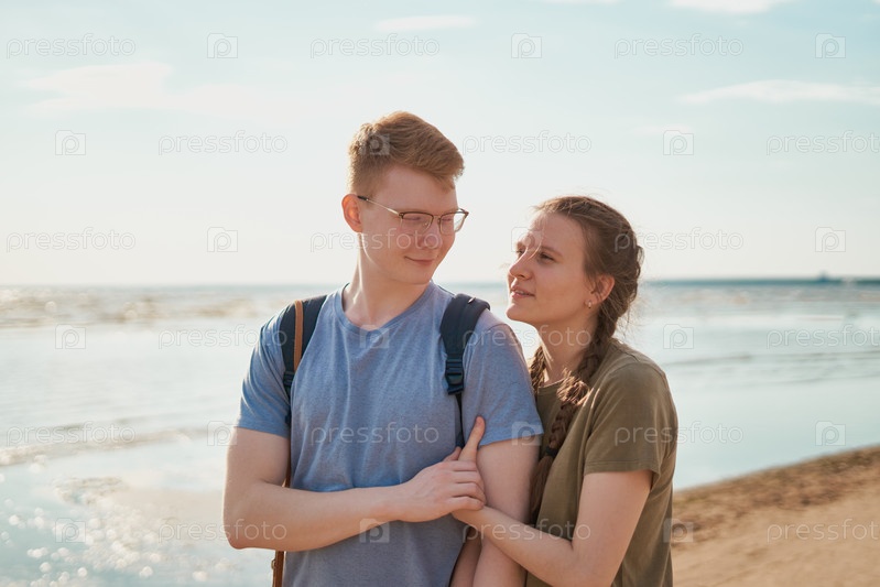 Тысячелетняя пара обнимается и позирует на пляже в солнечный день