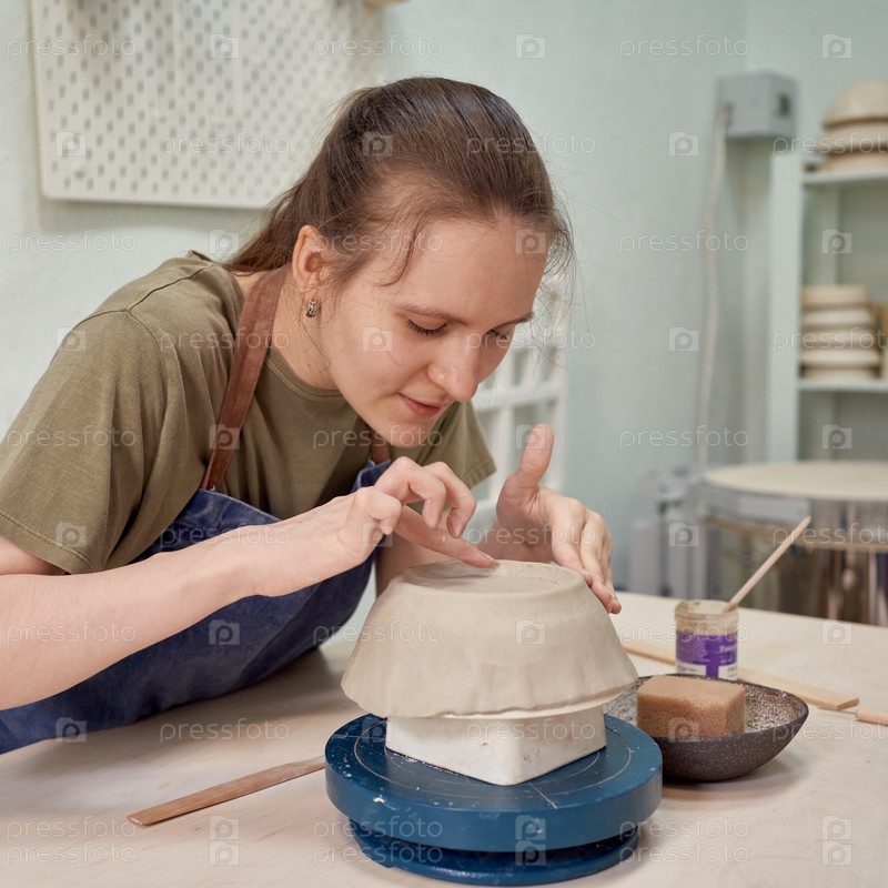 Восхитительная ученица, работающая над керамической чашей в мастерской