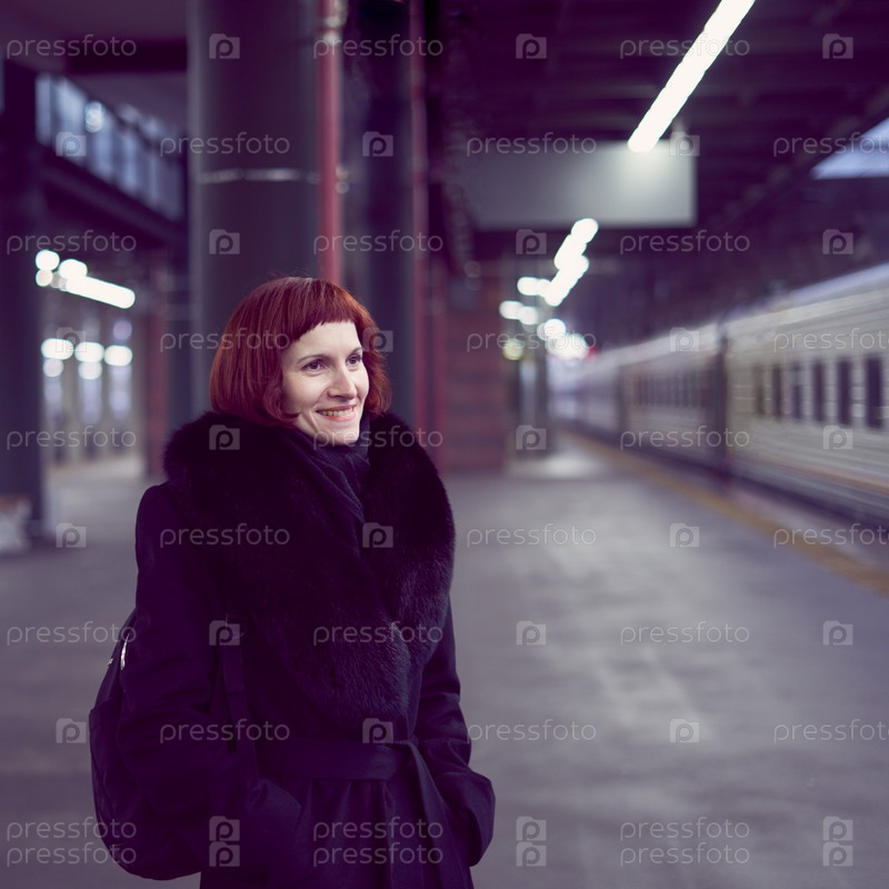 Железнодорожная станция. Красивая девушка стоит на платформе и ждет поезда. Женщина путешествует налегке