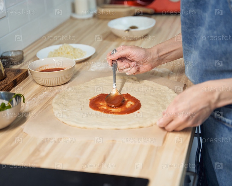 Безликая женщина возглавляет деревенское итальянское домашнее тесто для пиццы Маргарита. Домашняя еда