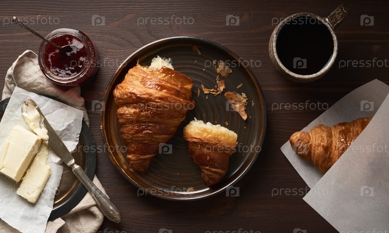 Утренний завтрак с ломтиком круассана на тарелке, чашкой кофе, джемом и маслом. Темно-коричневый стол, утренняя рутина, медленная жизнь. Вид сверху