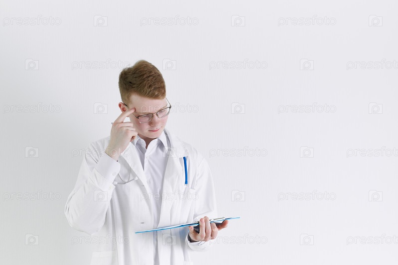 Молодой врач-стажер стоит на белом фоне. Красивый рыжеволосый мужчина думает