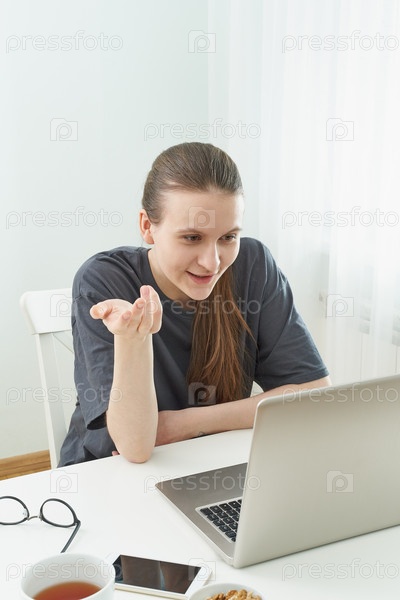Девушка с недоверием слушает или смотрит информацию на компьютере. Скептическое выражение. Фейковые новости