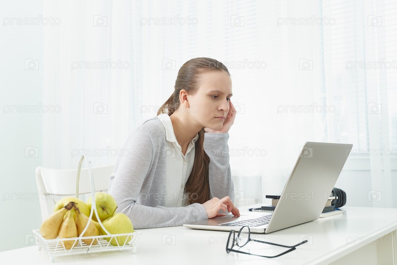 Дистанционное обучение для студентов. Карантин, самоизоляция, социофобия. Молодая девушка слушает