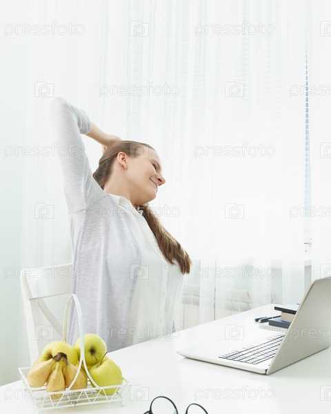 Женщина вытягивает руки, разминает спину от усталости. Долгое сидение за компьютером, мышечные судороги