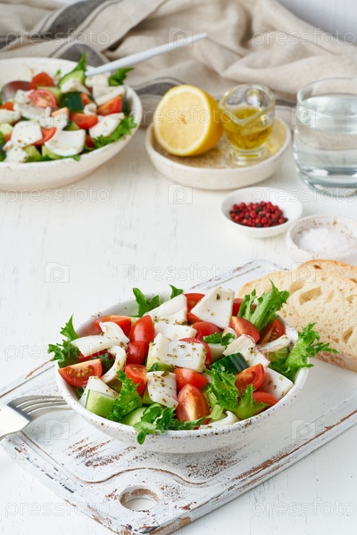 Салат с кальмарами, огурцами, помидором и листьями салата. LCHF, FODMAP, палеодиета. Свежая весенняя витаминная смесь. Здоровая средиземноморская еда, сбалансированное питание. Вертикальный вид со стороны