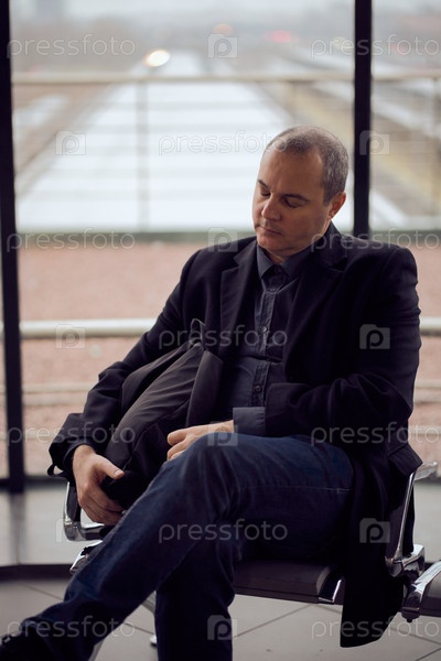 Железнодорожная станция. Зрелый мужчина в деловой одежде спит, сидит в зале ожидания и ждет поезда. Вечер темный