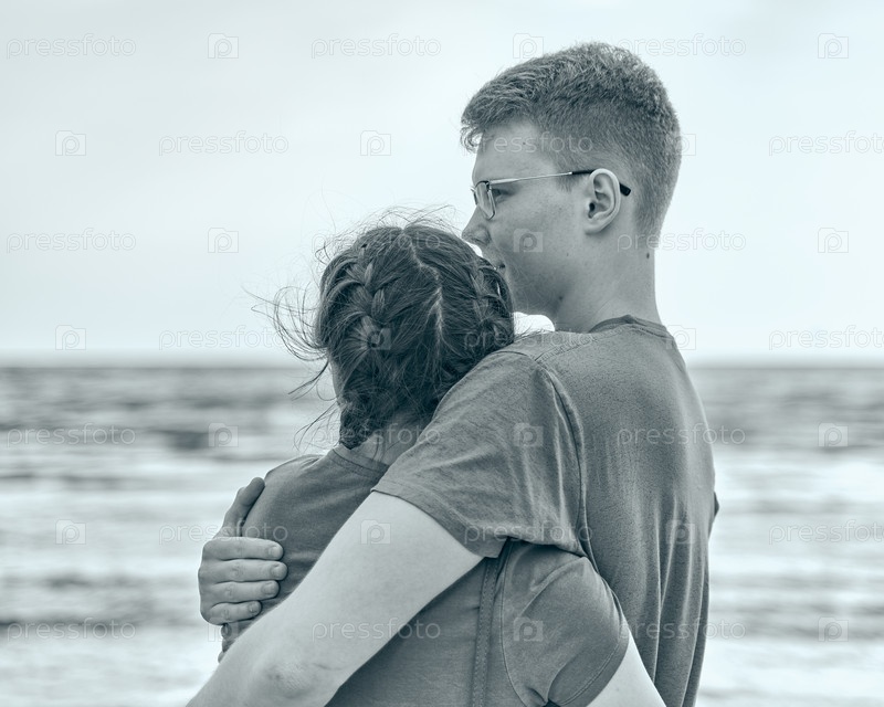 Пикник на пляже с едой и напитками. Юные мальчик и девочка обнимаются. Черное и белое