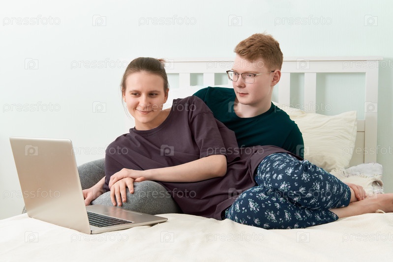 Влюбленный подросток лежит на кровати и смотрит фильмы на ноутбуке во время карантина из-за пандемии коронавируса