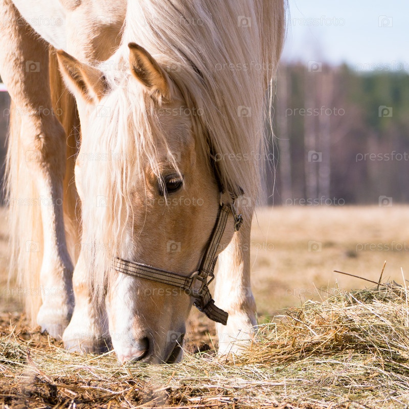 Женская лошадь ест сухое сено на поле при солнечном свете