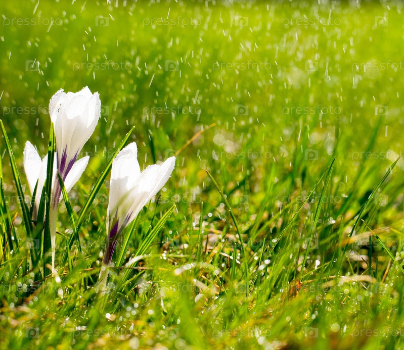 Цветы крокуса на лугу под солнцем под дождем