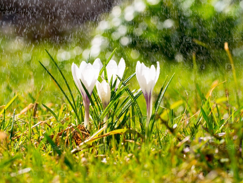 Цветы крокуса на лугу под солнцем под дождем