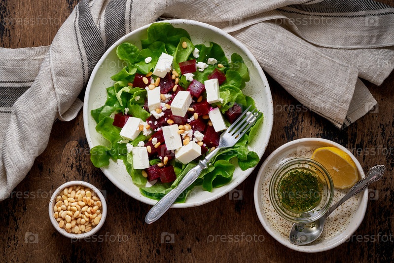 Полезный салат со свеклой, творогом, фетой и кедровыми орешками, салатом. Низкоуглеводная кето-кетогенная диета
