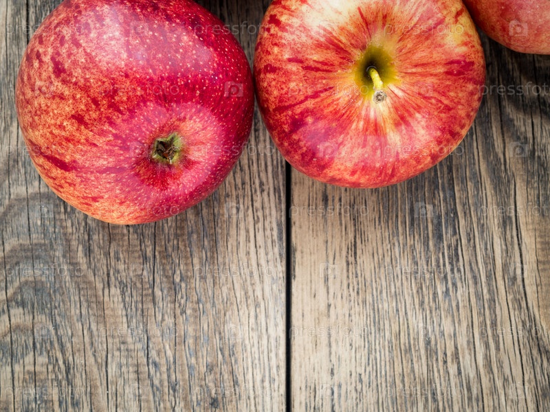 Спелые сочные красные яблоки на деревянном столе, вид сверху