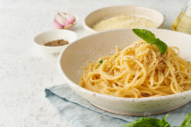 Паста Качио и Пепе. Спагетти с сыром пармезан и перцем. Традиционная итальянская кухня. Вид сверху, вид сбоку