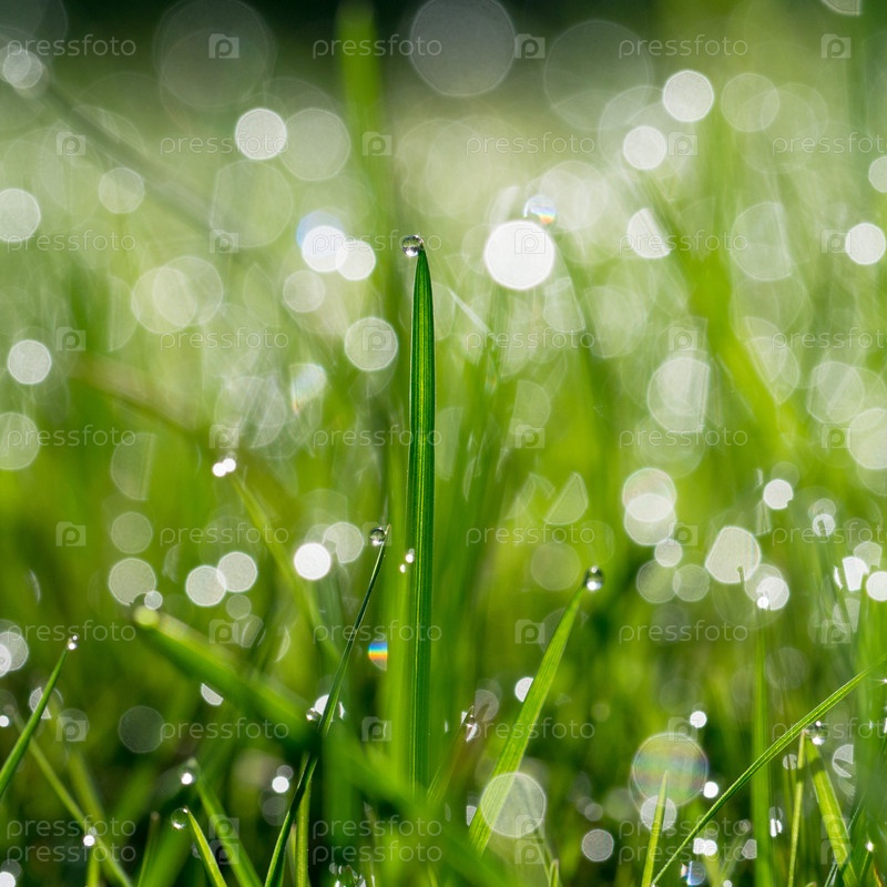 Свежая зеленая трава с каплями воды на фоне солнечного света