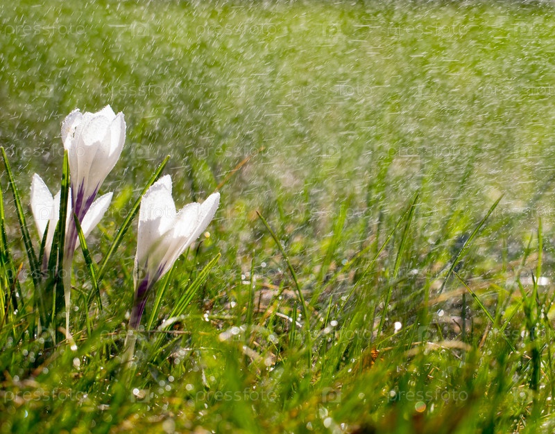 Цветы крокуса на лугу под солнцем под дождем