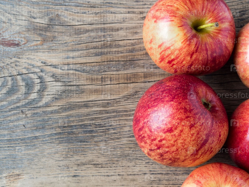 Спелые сочные красные яблоки на деревянном столе, вид сверху