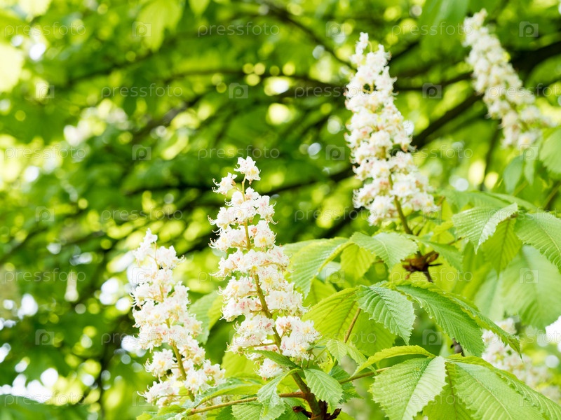 Ветка каштана с белыми цветами в солнечном свете