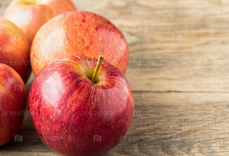 Спелые сочные красные яблоки на деревянном столе