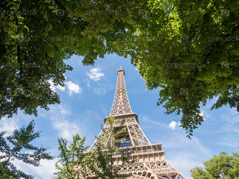 Эйфелева башня в Париже на фоне голубого неба и листьев деревьев, большой самолет