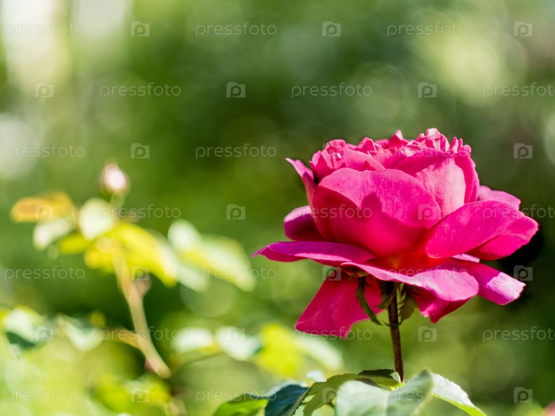 Цветочный солнечный фон с красным цветком розы с местом для текста. Фон с эффектом боке