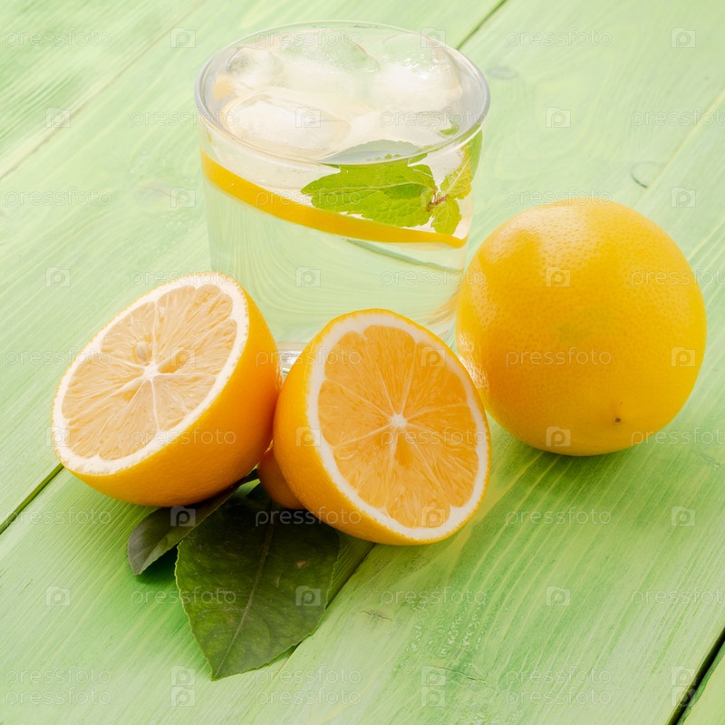 Лимонад в стакане, половина лимона, свежие листья на зеленом столе. Освежающий холодный напиток воды со льдом, мятой и ломтиками лимона, вид сбоку
