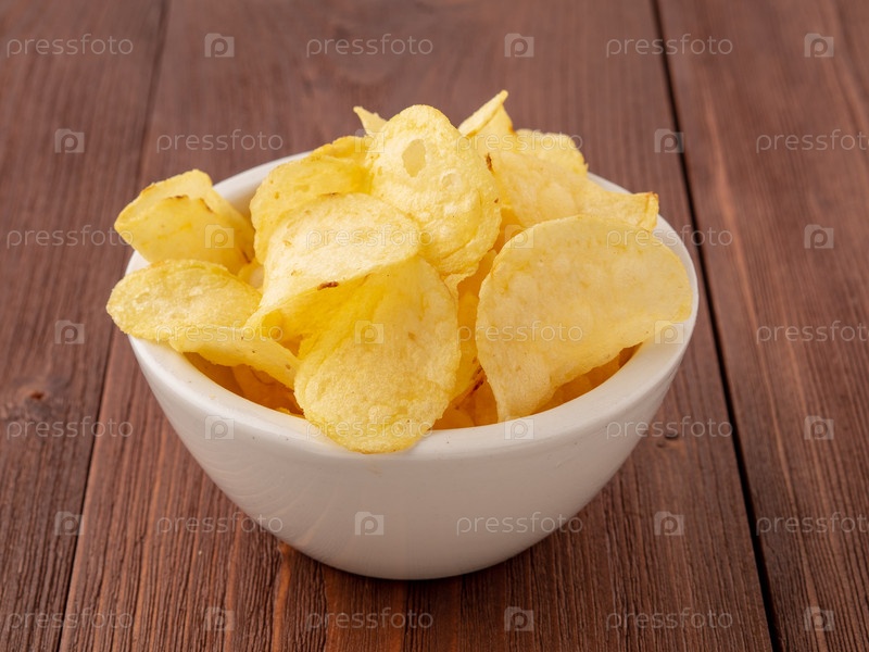 Картофельные чипсы в белой миске на коричневом деревянном столе