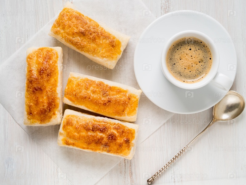 Утро Завтрак со свежими булочками из слоеного теста и чашкой кофе на белом деревянном столе. Вид сверху, свет дня