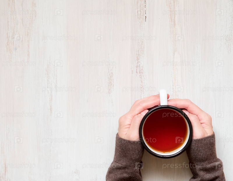 Женские руки держат кружку горячего черного чая. Холодная зима, теплая одежда, свитер. Вид сверху. Белый старый деревянный фон