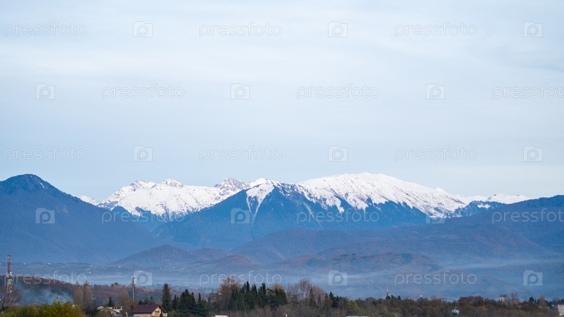 Туман в горах, заснеженные вершины, горизонтальный снимок, пейзаж