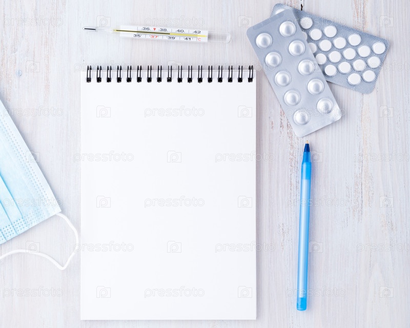 Вид сверху на стол в кабинете врача. Откройте блокнот с пустой страницей, лекарством, ручкой, маской, термометром. Напишите план лечения