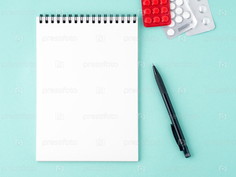 Откройте блокнот с пустой белой чистой страницей, чтобы написать план лечения заболевания. Таблетки, ручка, бумага на синем фоне, вид сверху