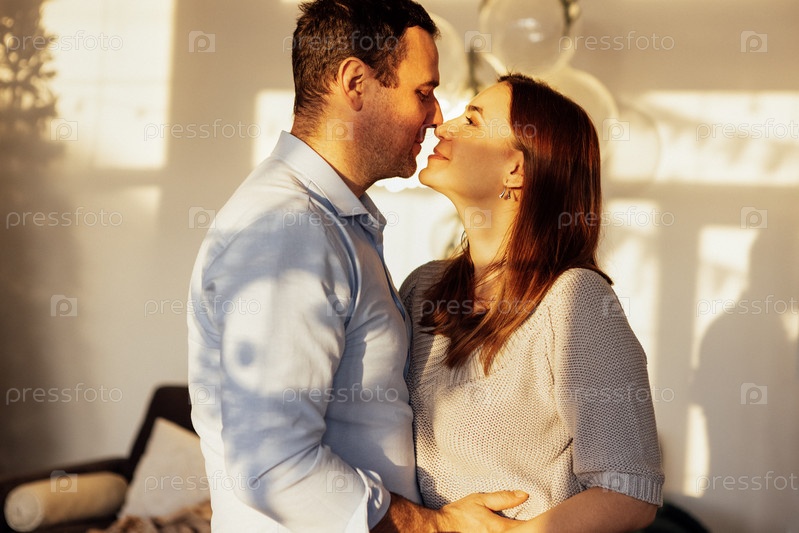 Счастливая влюбленная супружеская пара улыбается друг другу дома. Молодой человек обнимает свою прекрасную жену в гостиной. Привлекательная женщина целует своего красивого мужа