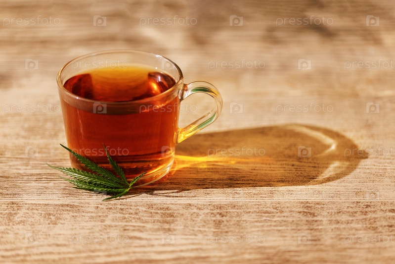 Прозрачная чашка вкусного крепкого черного чая с листом конопли. Стеклянная чашка и пенька на деревянном столе. Полезный органический напиток растительного происхождения